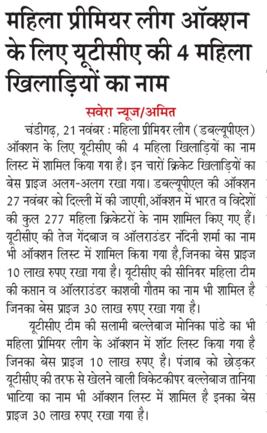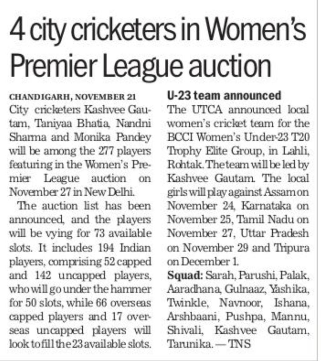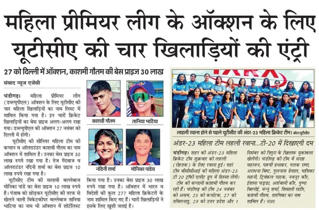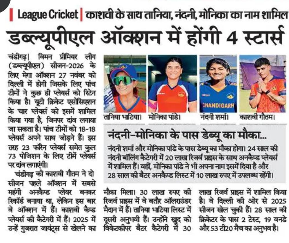 महिला प्रीमियर लीग के ऑक्शन के लिए यूटीसीए की चार खिलाड़ियों की एंट्री +11 more stories27 को दिल्ली में ऑक्शनChandigarh CricketNov 22, 2025Share
