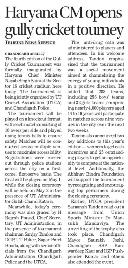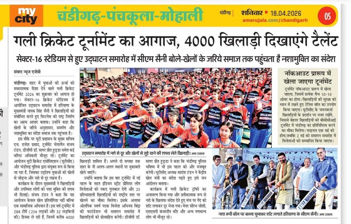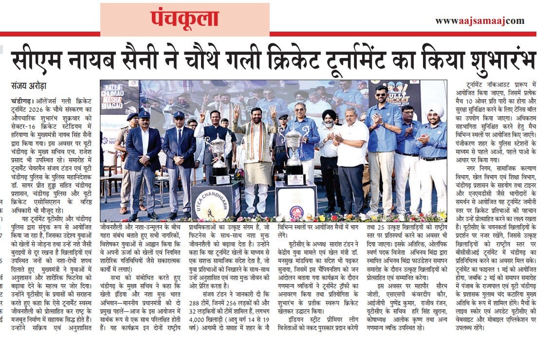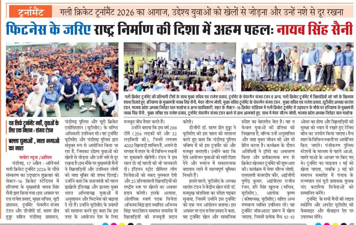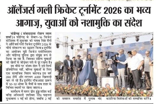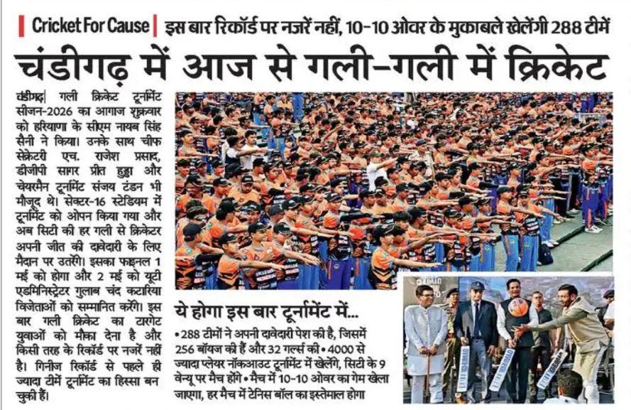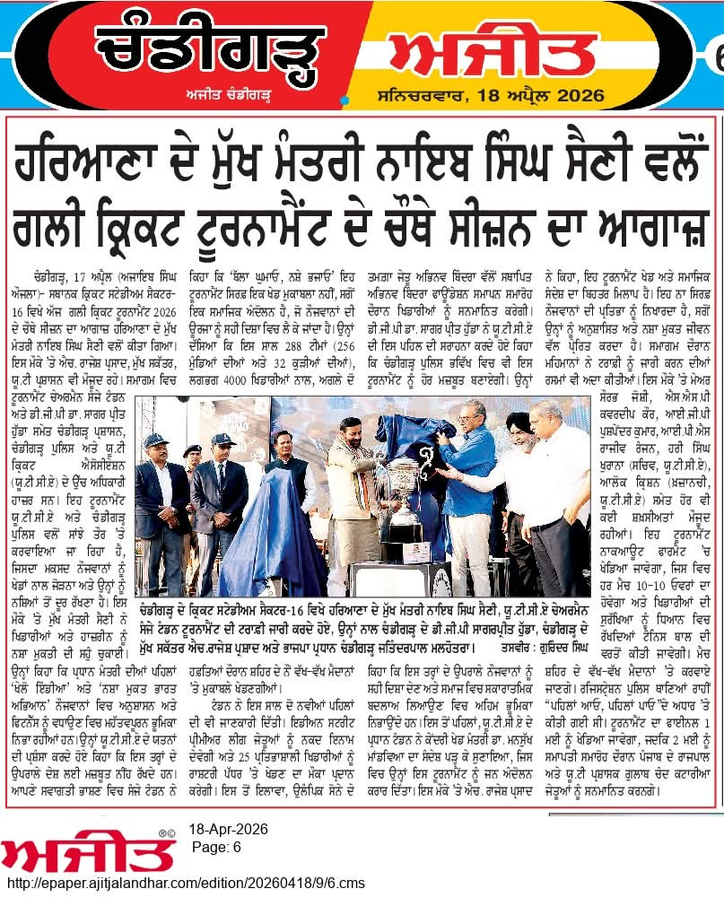 चंडीगढ़ में चौथे गली क्रिकेट टूर्नामेंट 2026 का शुभारंभ +18 more stories यह सिर्फ टूर्नामेंट नहीं, युवाओं के लिए एक मिशन: संजय टंडनChandigarh CricketApr 18, 2026Share