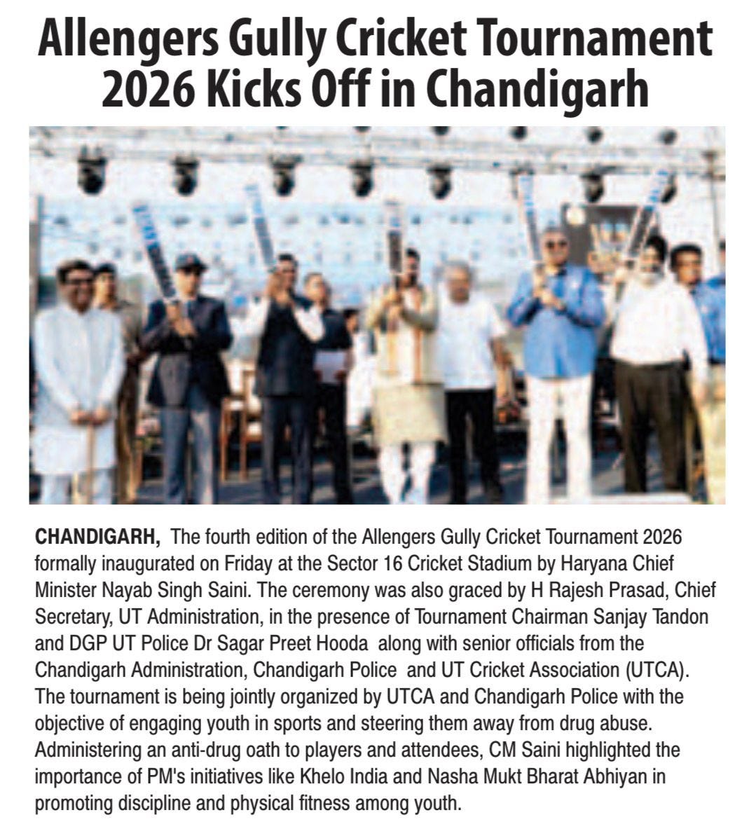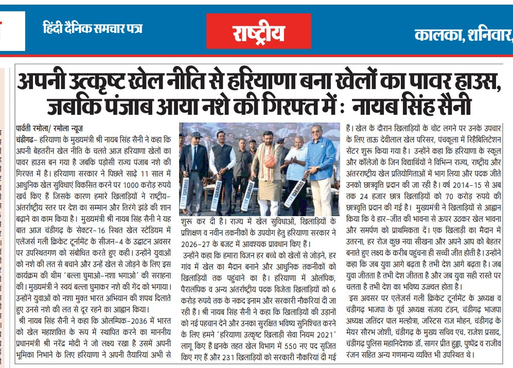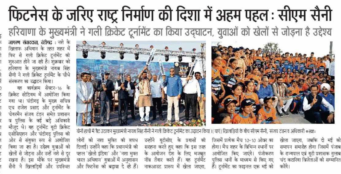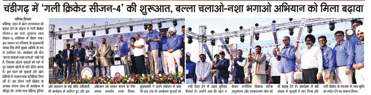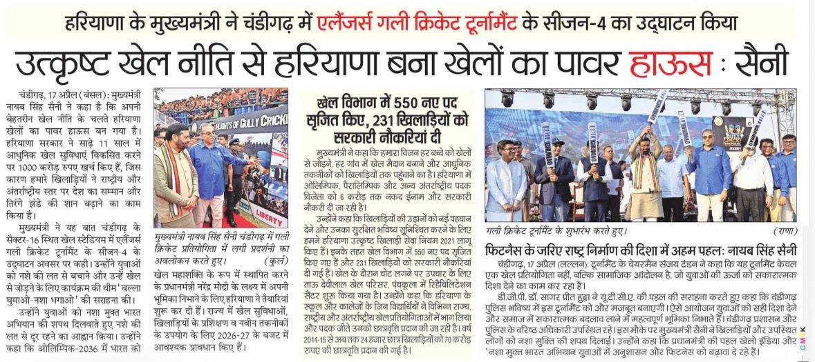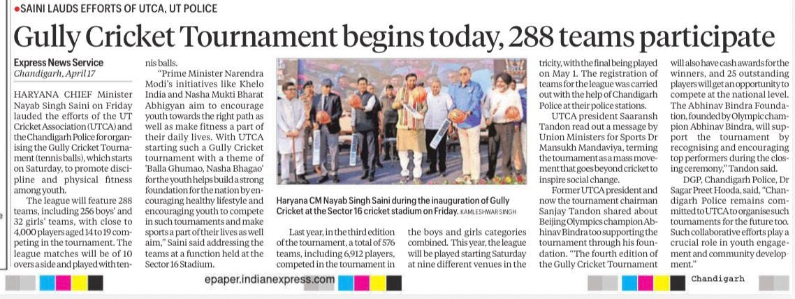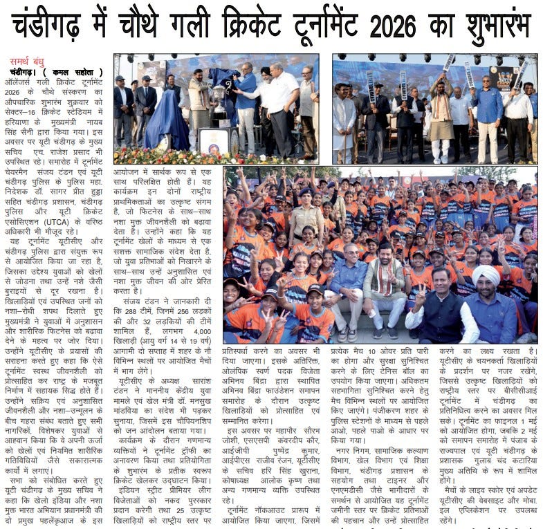 चंडीगढ़ में चौथे गली क्रिकेट टूर्नामेंट 2026 का शुभारंभ +18 more stories यह सिर्फ टूर्नामेंट नहीं, युवाओं के लिए एक मिशन: संजय टंडनChandigarh CricketApr 18, 2026Share