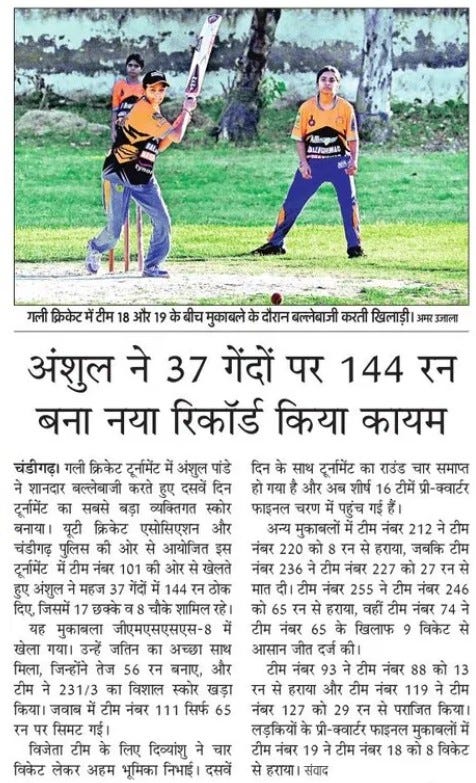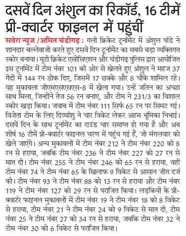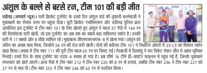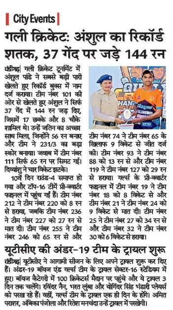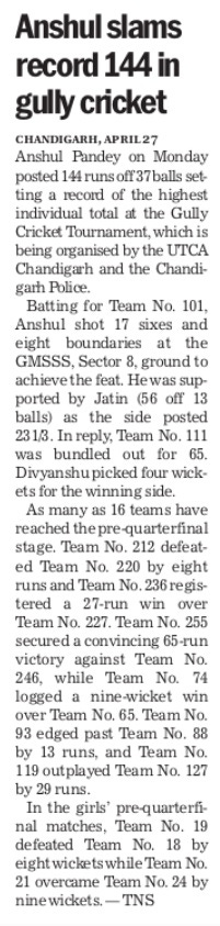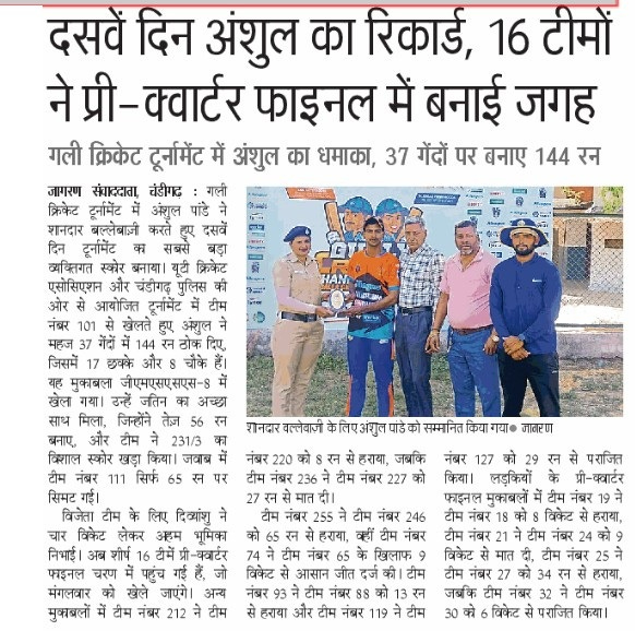 गली क्रिकेटः अंशुल का रिकॉर्ड शतक, 37 गेंद पर जड़े 144 रन +10 more storiesChandigarh CricketApr 28, 2026Share