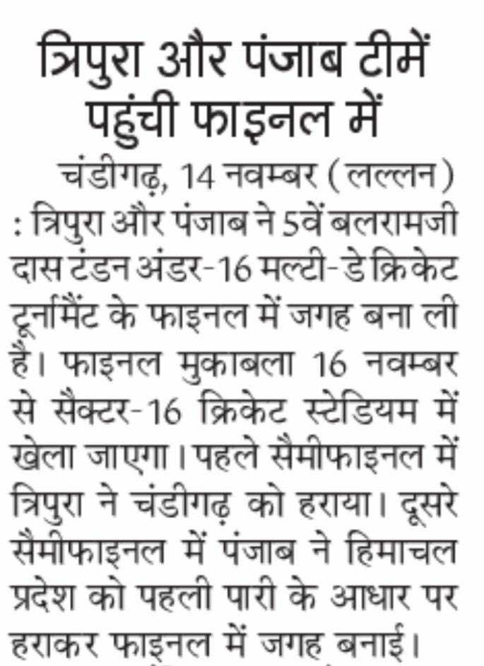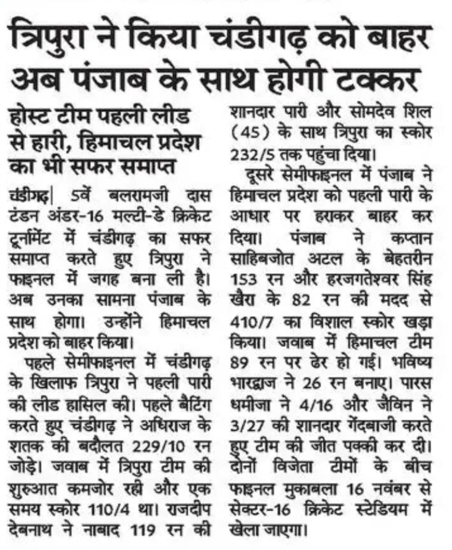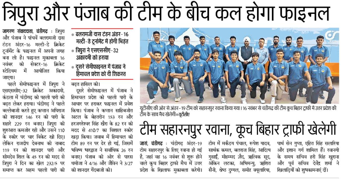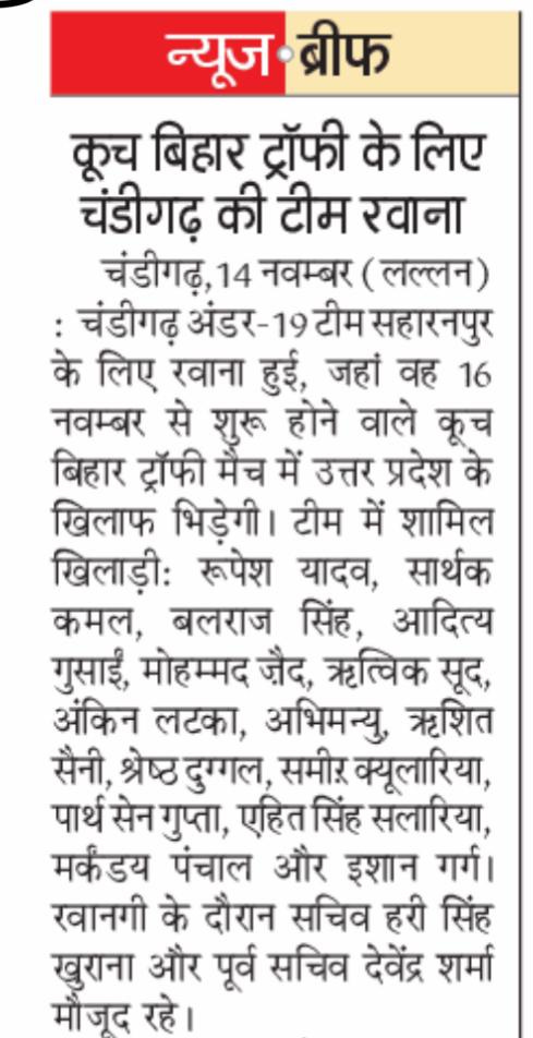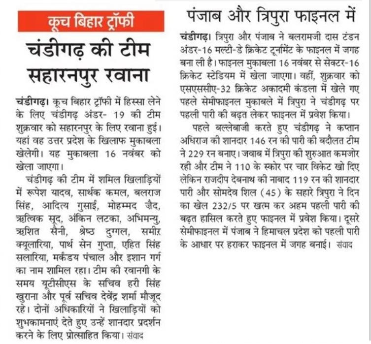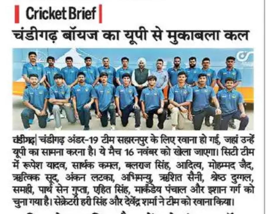 चंडीगढ़ बॉयज का यूपी से मुकाबला कल +5 more storiesचंडीगढ़ अंडर-19 टीम सहारनपुर के लिए रवानाChandigarh CricketNov 15, 2025Share