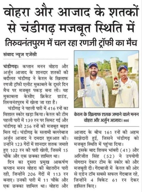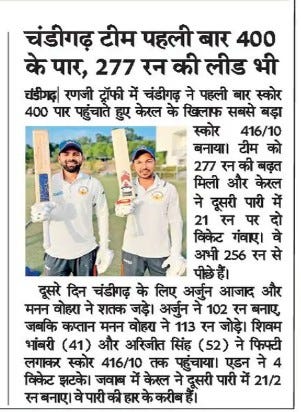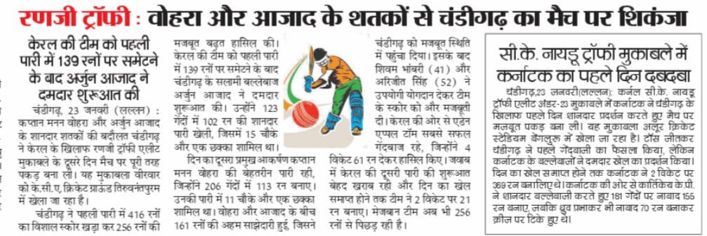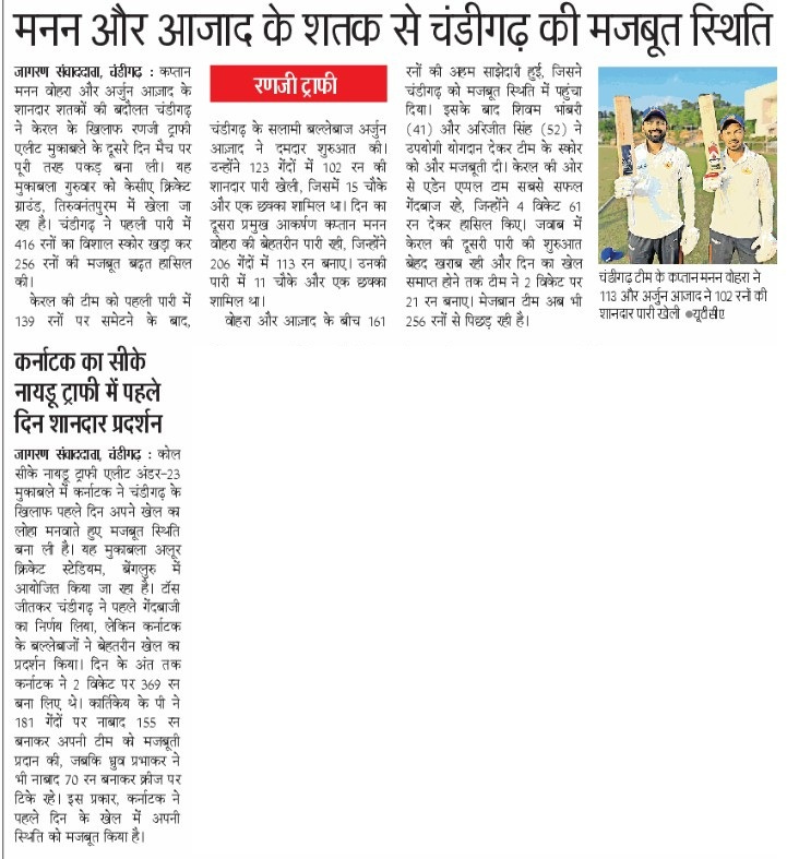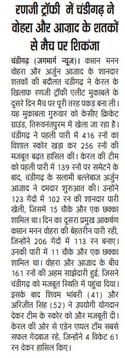 वोहरा और आजाद के शतकों से चंडीगढ़ मजबूत स्थिति में +5 more stories तिरुवनंतपुरम में चल रहा रणजी ट्रॉफी का मैचChandigarh CricketJan 25, 20263Share