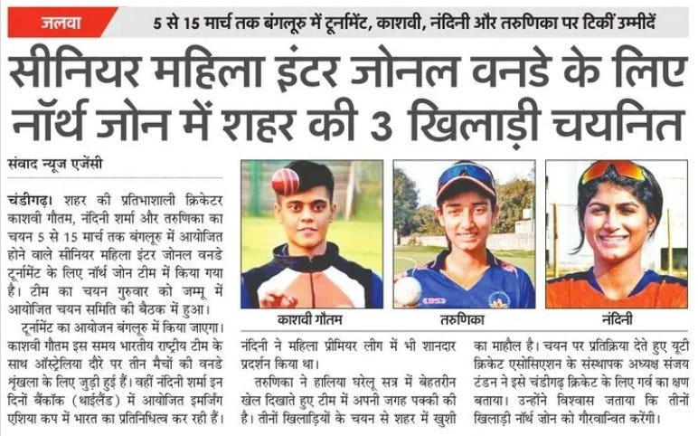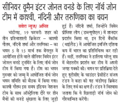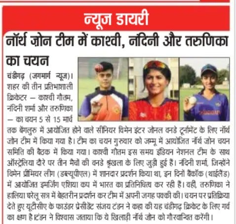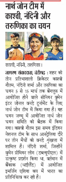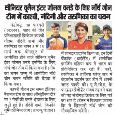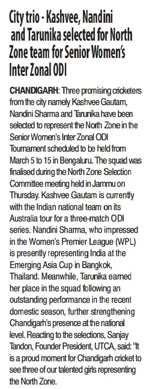 सीनियर वूमैन इंटर जोनल वनडे के लिए नॉर्थ जोन टीम में काशवी, नंदिनी और तरुणिका का चयन +6 more storiesChandigarh CricketFeb 20, 20262Share
