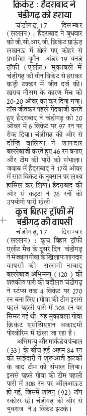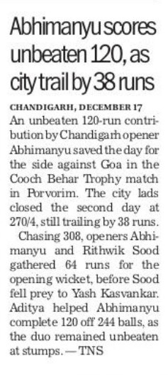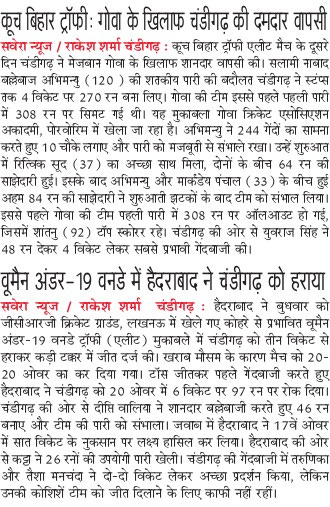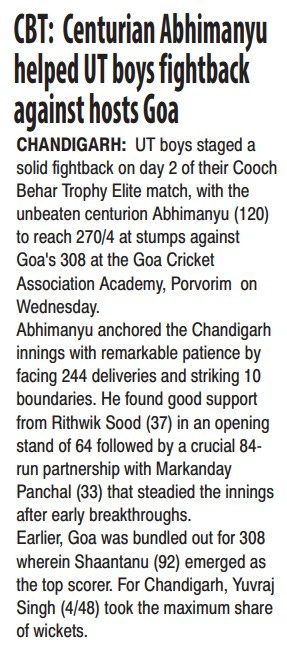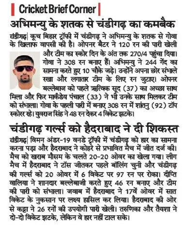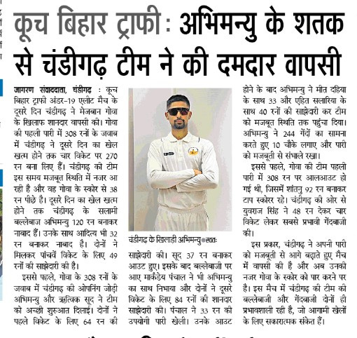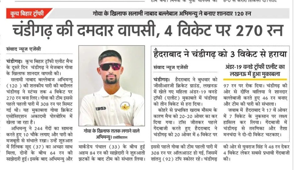 कूच बिहार बिहार ट्राफी : अभिमन्यु के शतक से चंडीगढ़ टीम ने की दमदार वापसी+7 more storiesChandigarh CricketDec 18, 2025Share