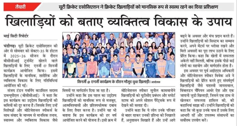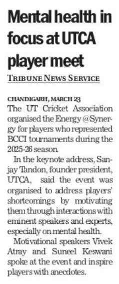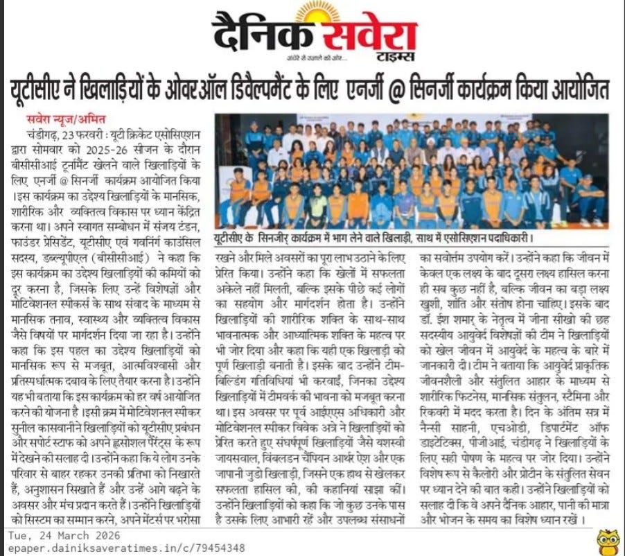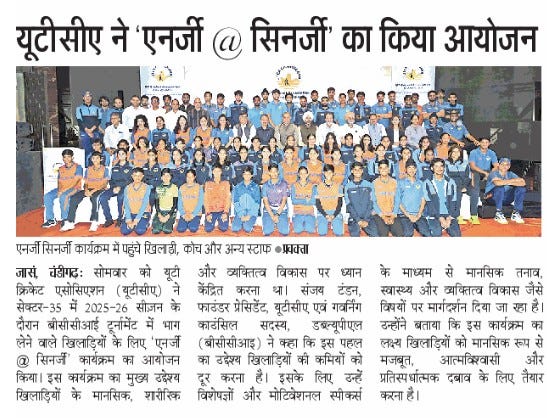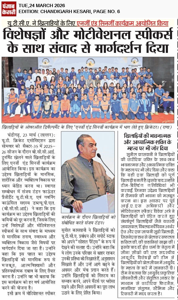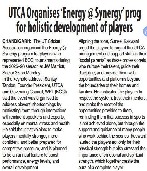 यूटीसीए ने खिलाड़ियों के ओवर ऑल डिवैल्पमैंट के लिए एनर्जी @ सिनर्जी कार्यक्रम किया आयोजित +8 more stories Chandigarh CricketMar 24, 20261Share