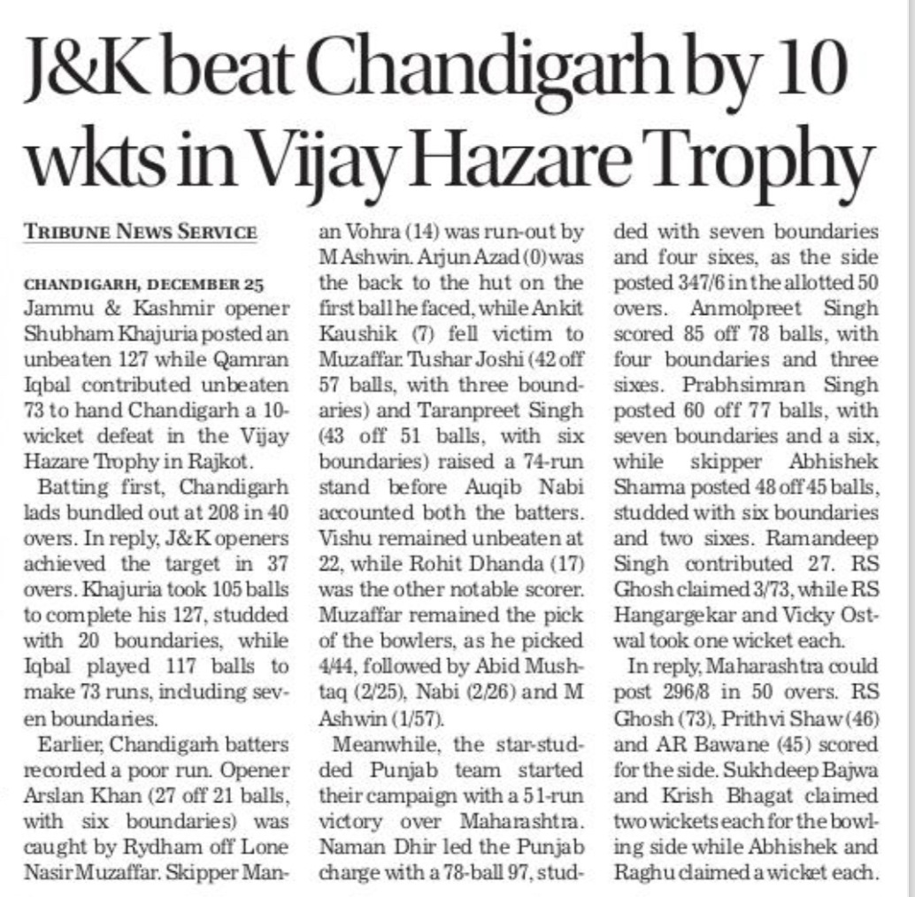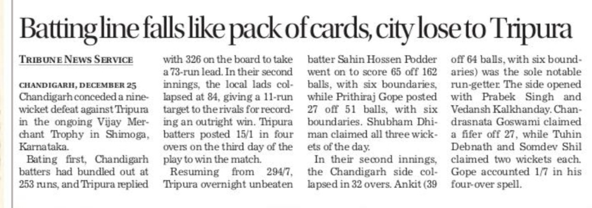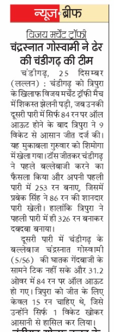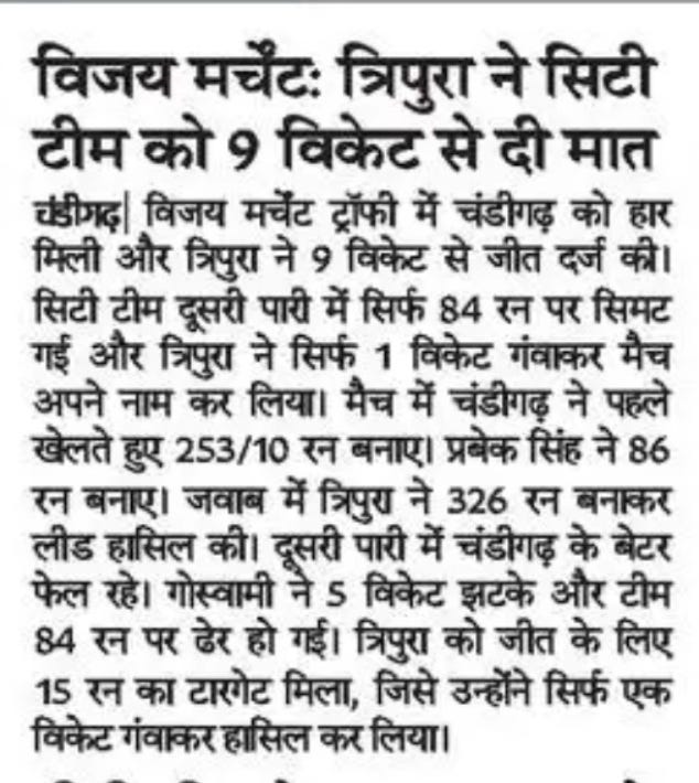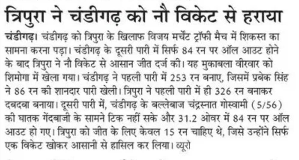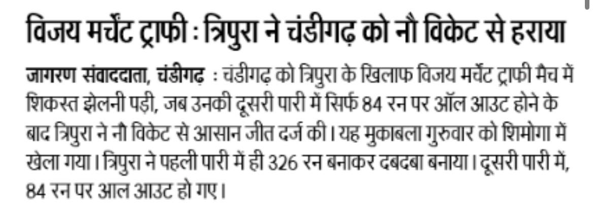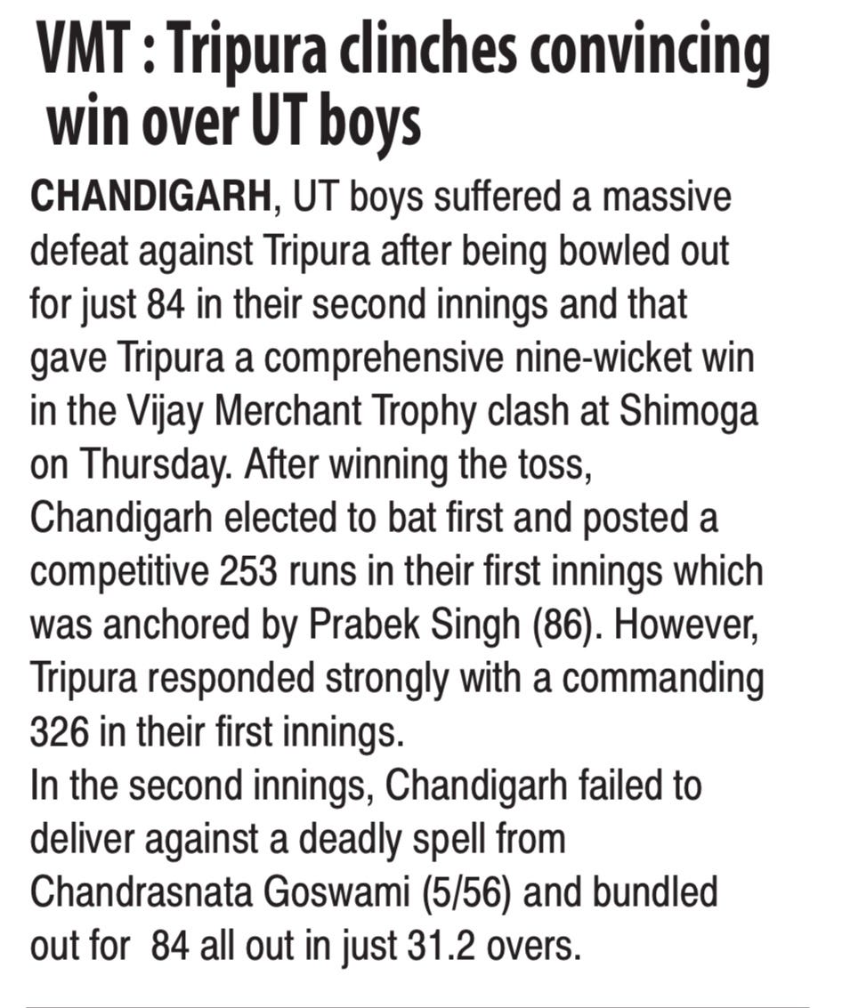 VMT: Tripura clinches convincing win over UT boys +6 more storiesChandigarh CricketDec 26, 20252Share